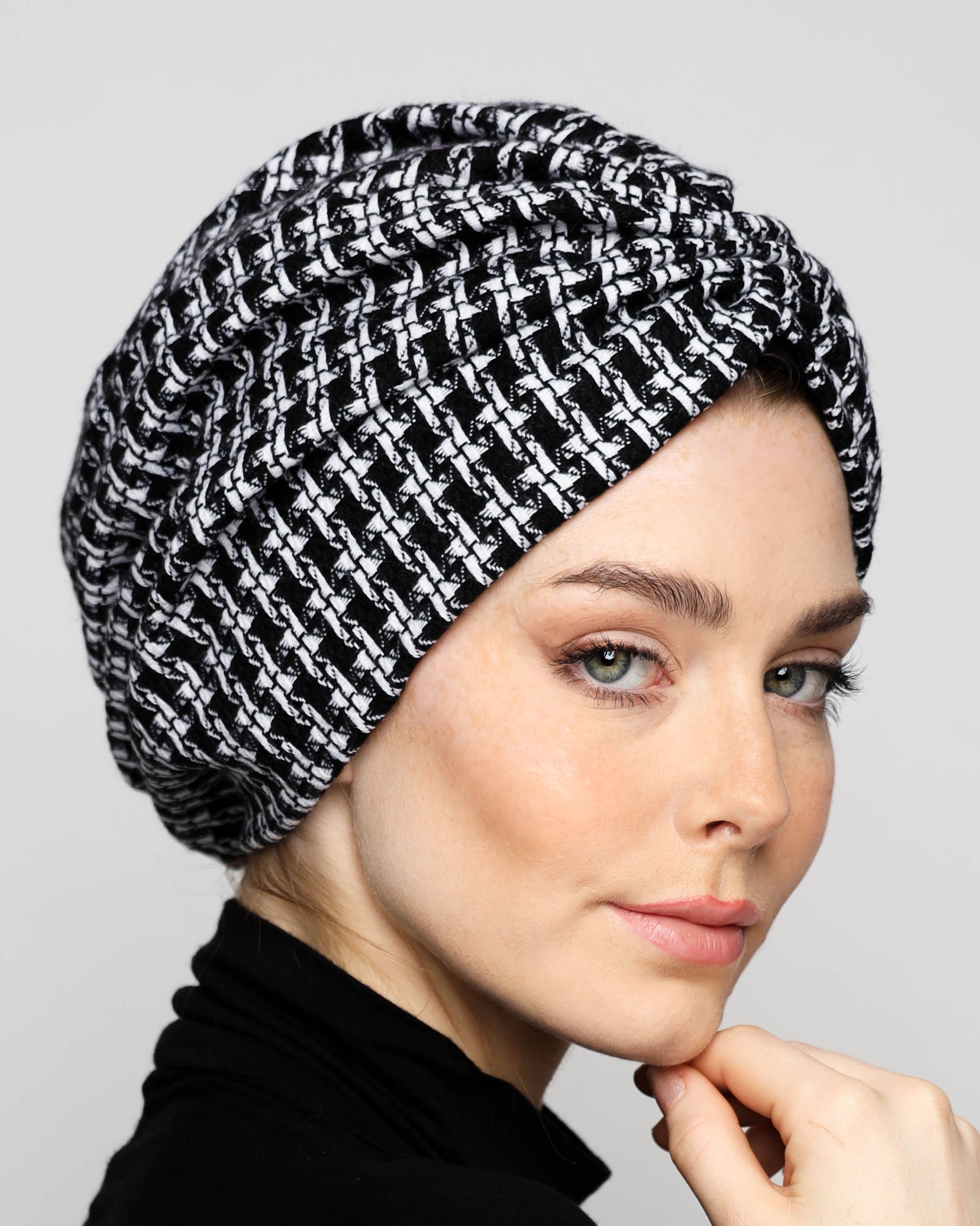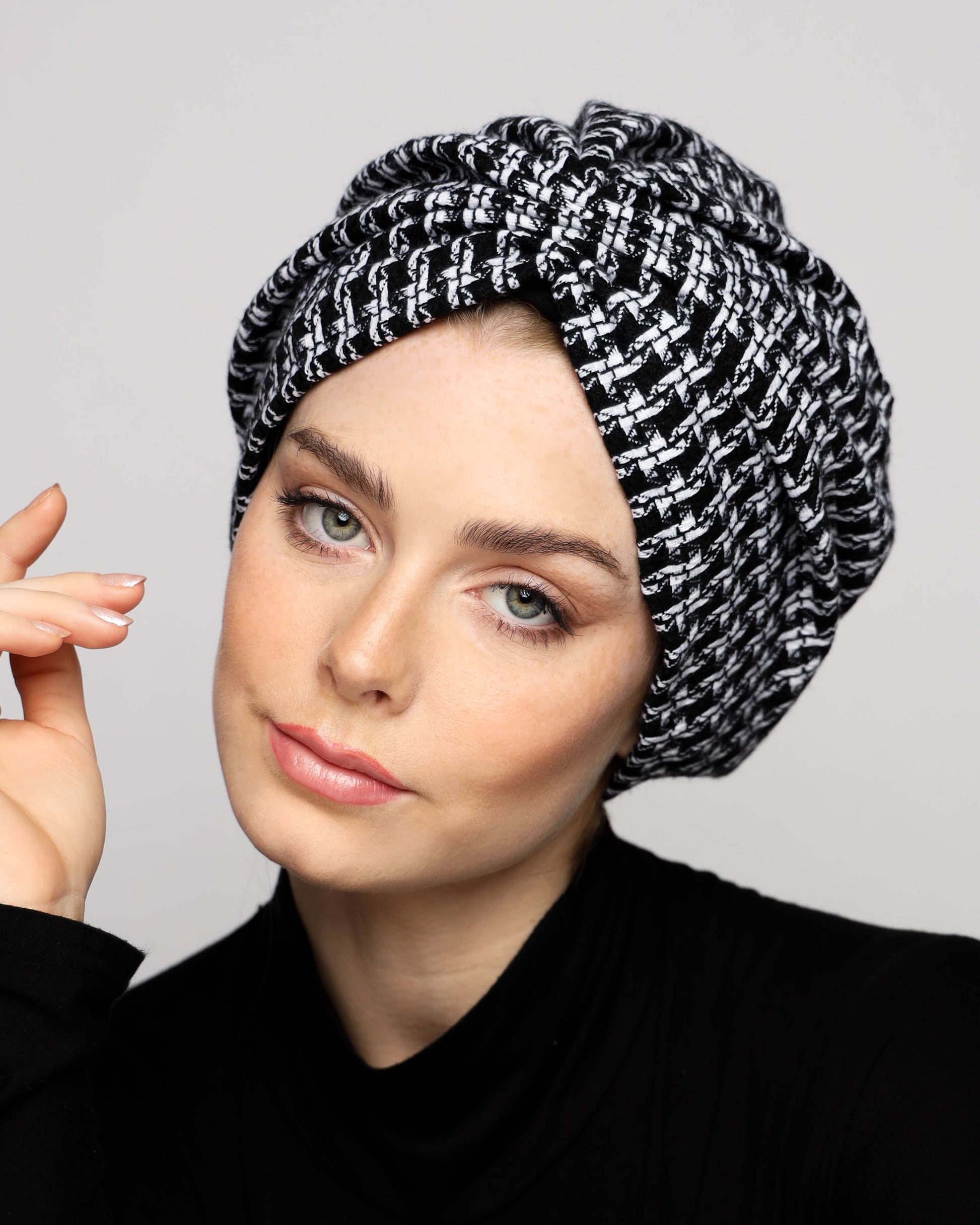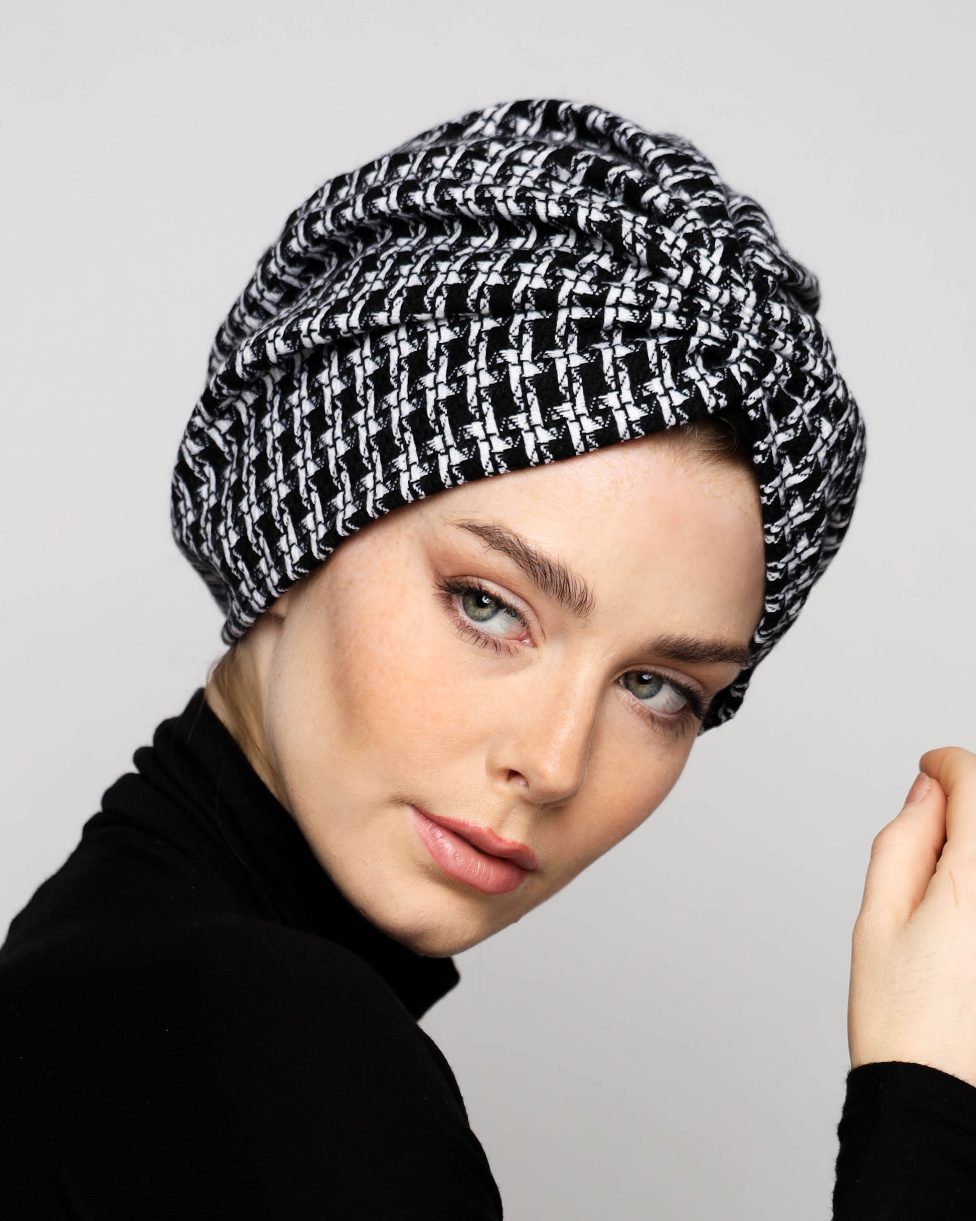 Elevate your winter look with our B&W Gathering Wool Turban. Made with a soft wool blend and lined with pure cotton, this turban provides both comfort and warmth. Perfect for any outdoor gathering, this luxurious accessory adds a touch of sophistication to any outfit.