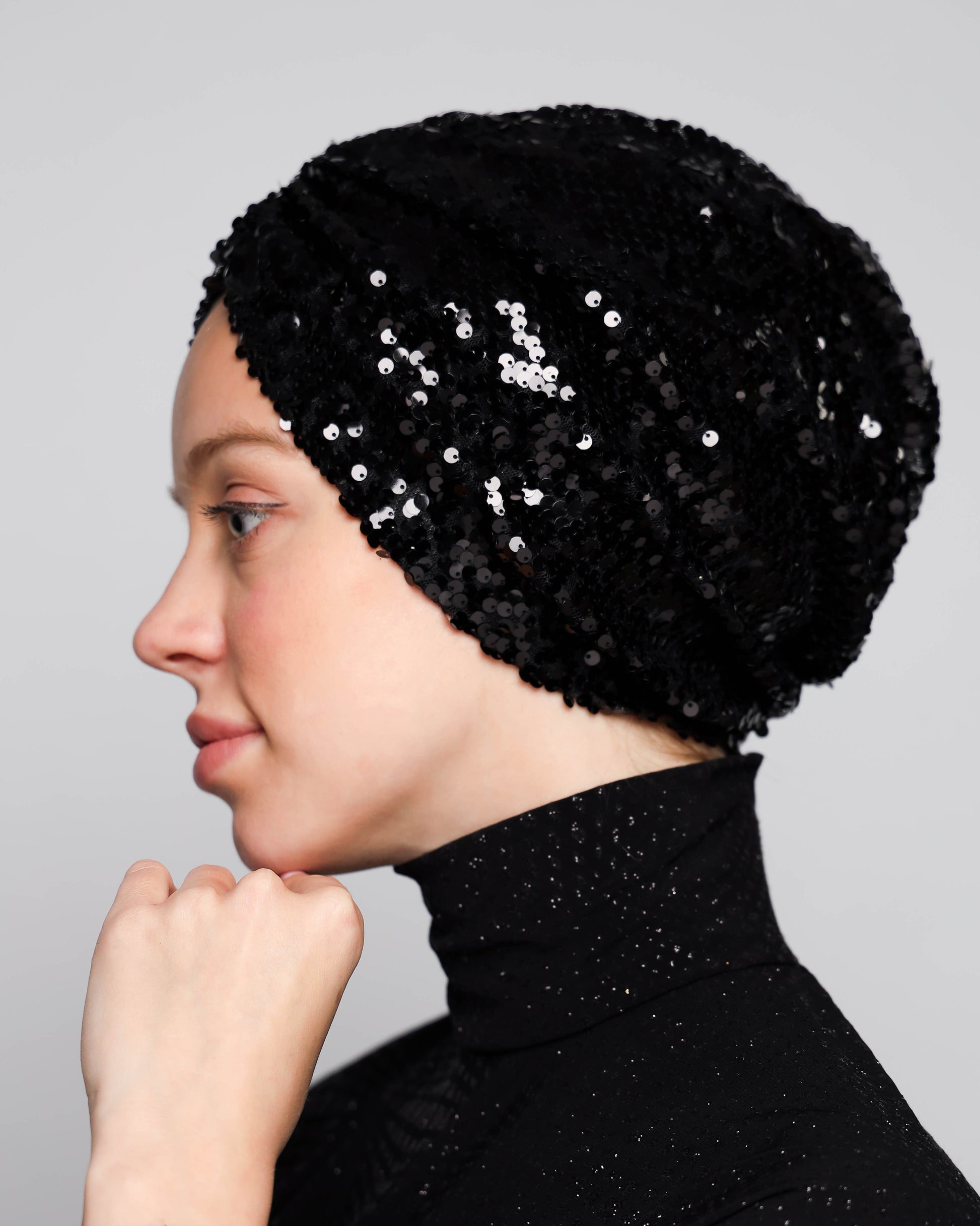 Elevate your style with our Black Sequin Gathering Turban. The intricate design, adorned with shimmering sequins, adds a touch of glamour to any outfit. Made from luxurious fabric, this turban not only looks chic, but also provides comfort and effortless elegance. A must-have accessory for any fashion-forward individual.