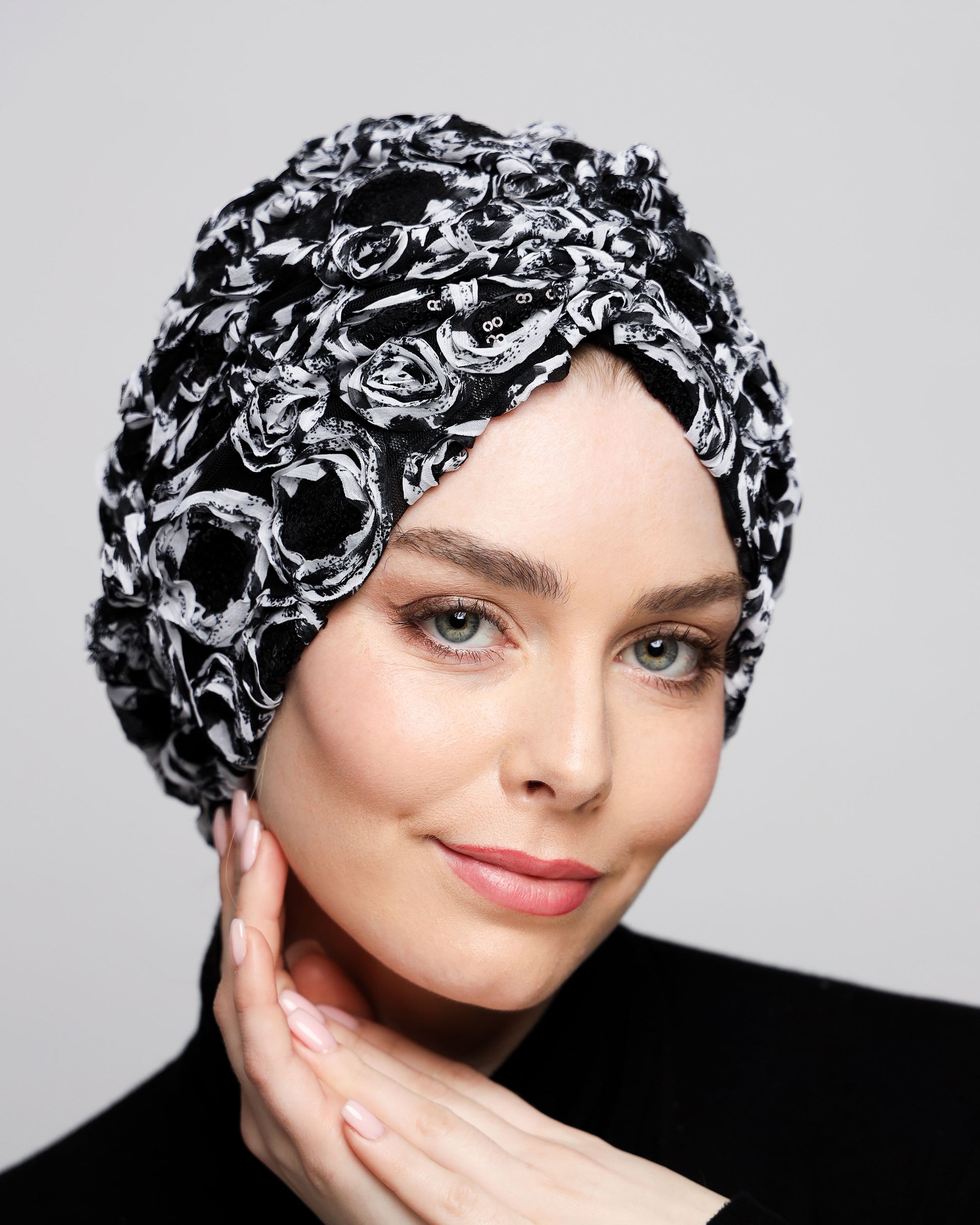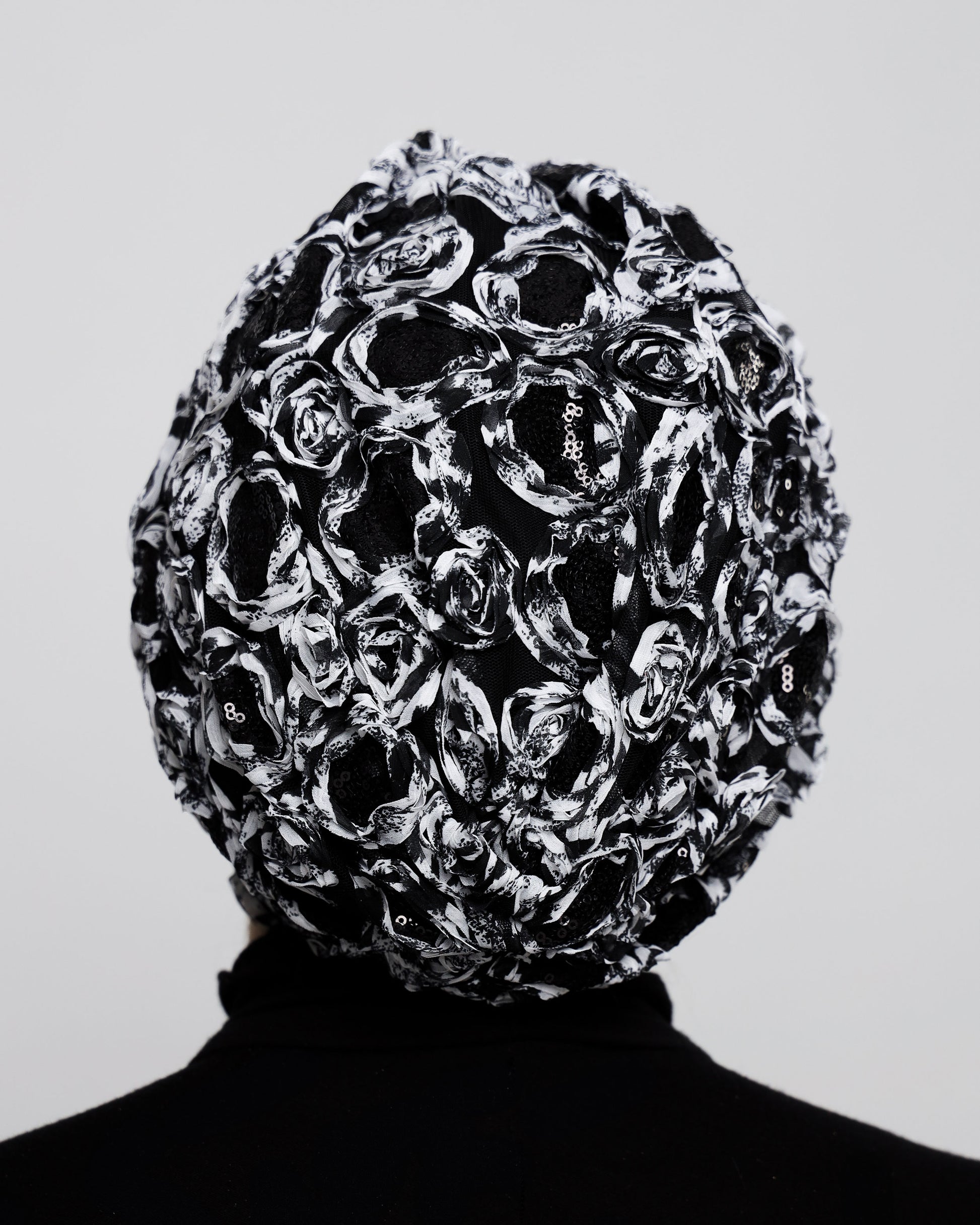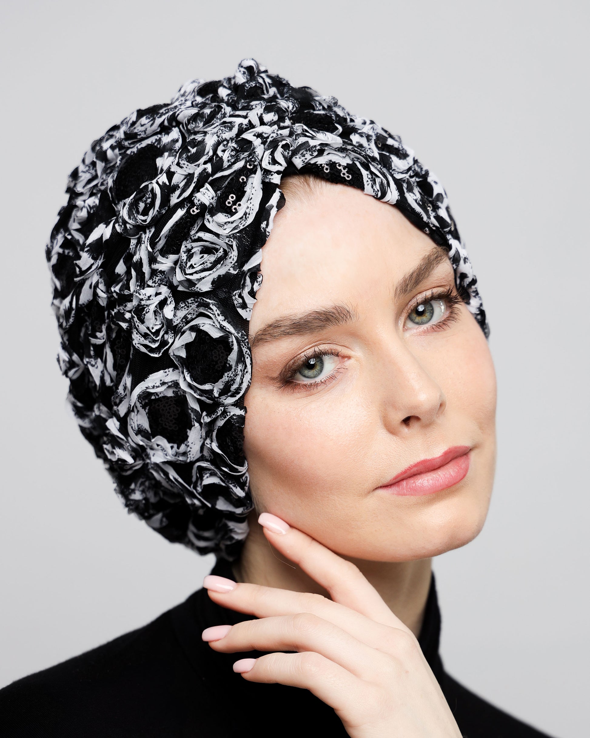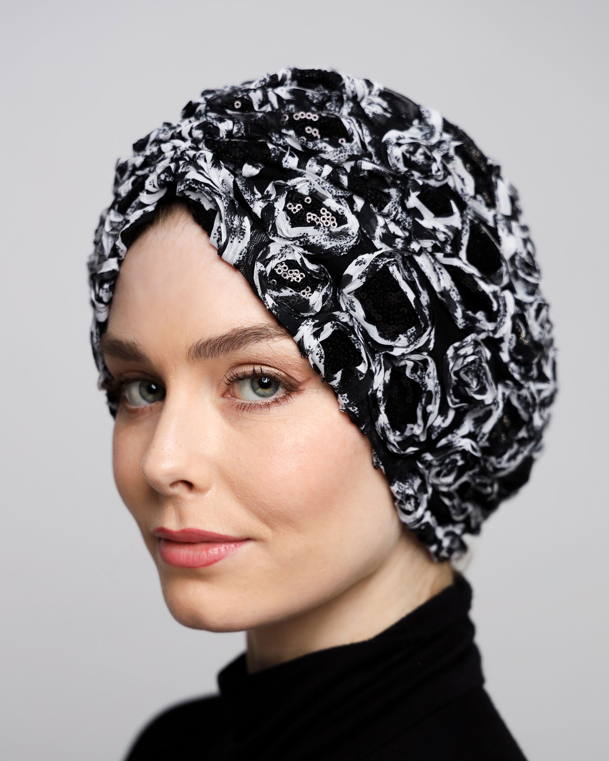 Elevate your style with our Black Sequin Gathering Turban. The intricate design, adorned with shimmering sequins, adds a touch of glamour to any outfit. Made from luxurious fabric, this turban not only looks chic, but also provides comfort and effortless elegance. A must-have accessory for any fashion-forward individual.