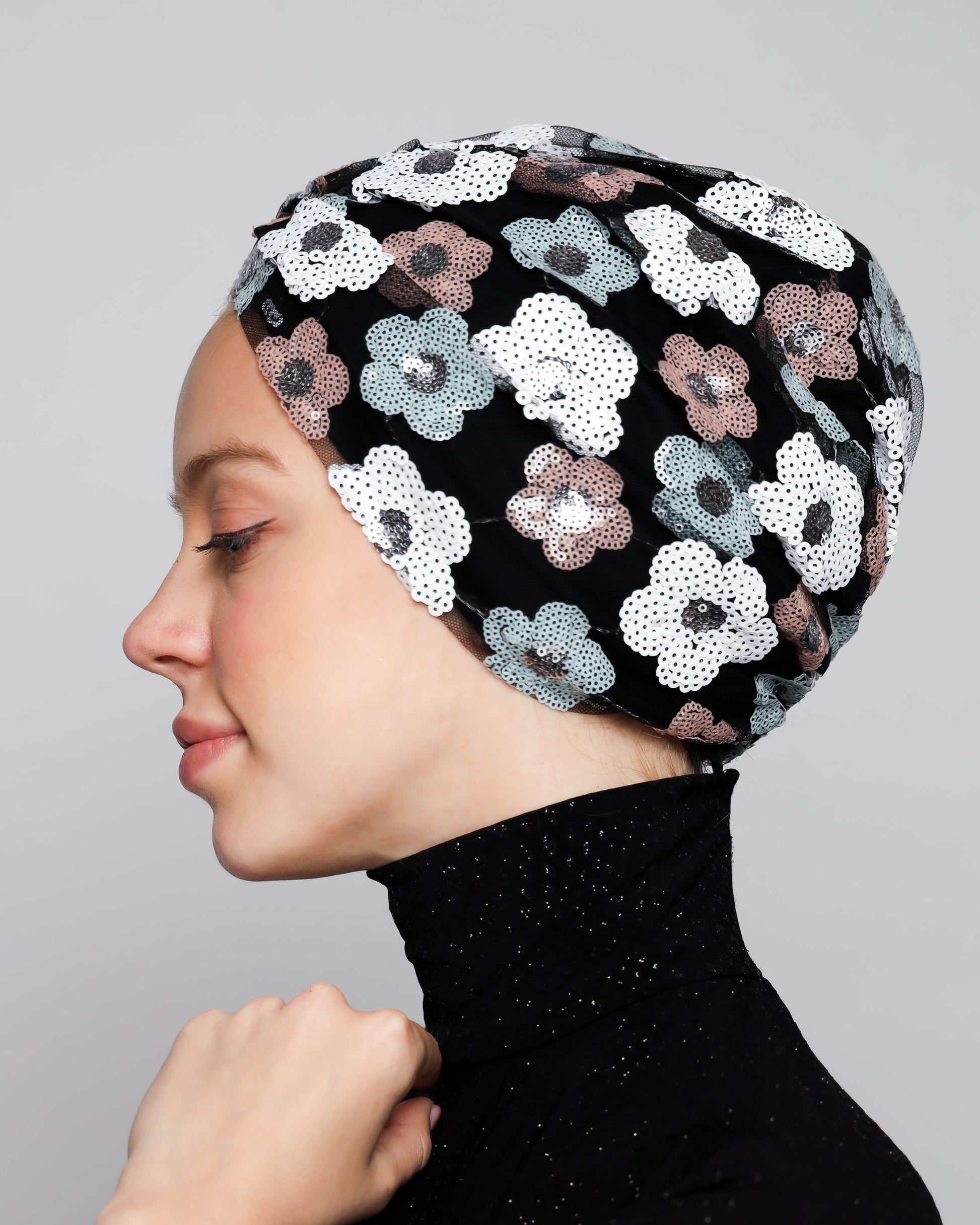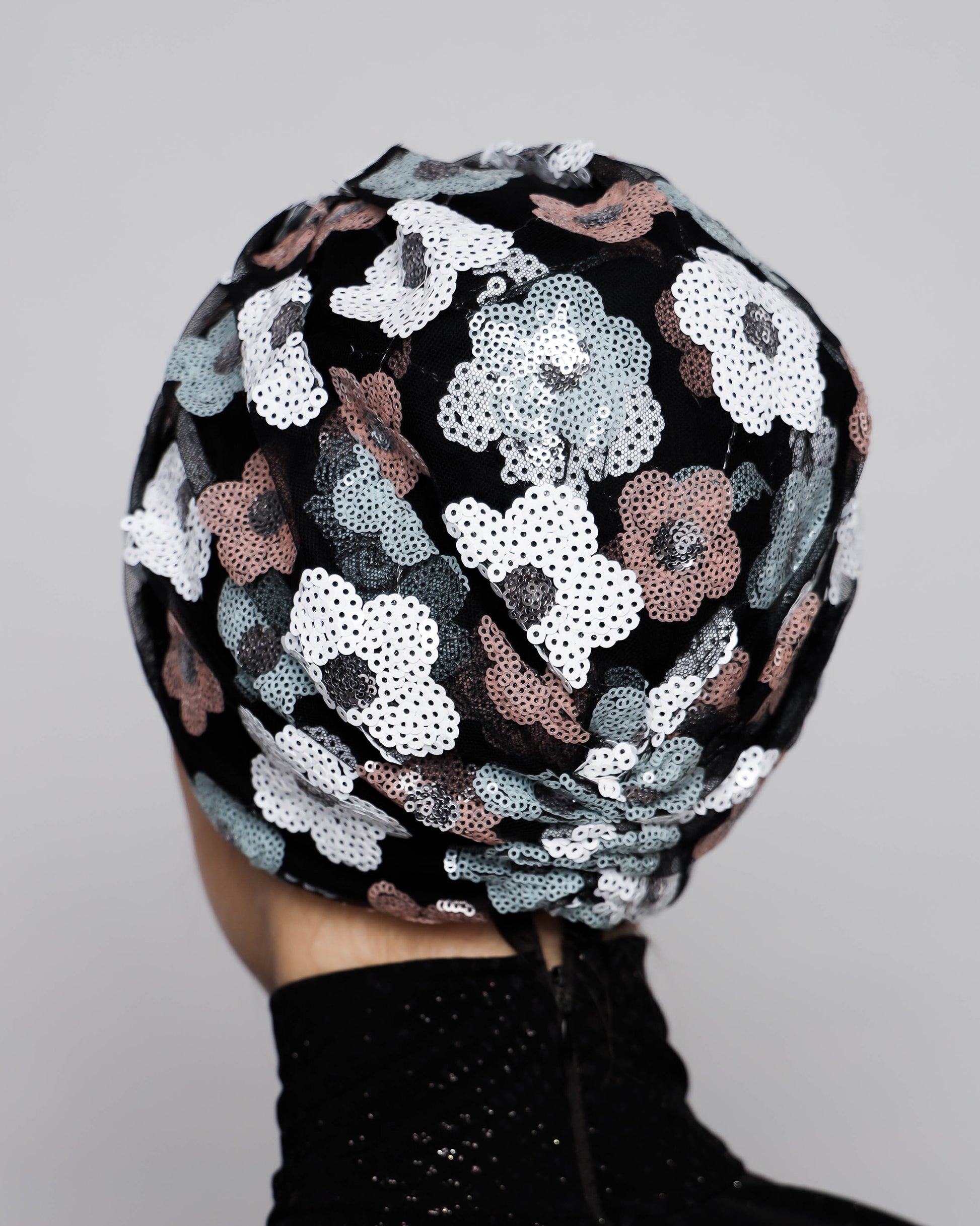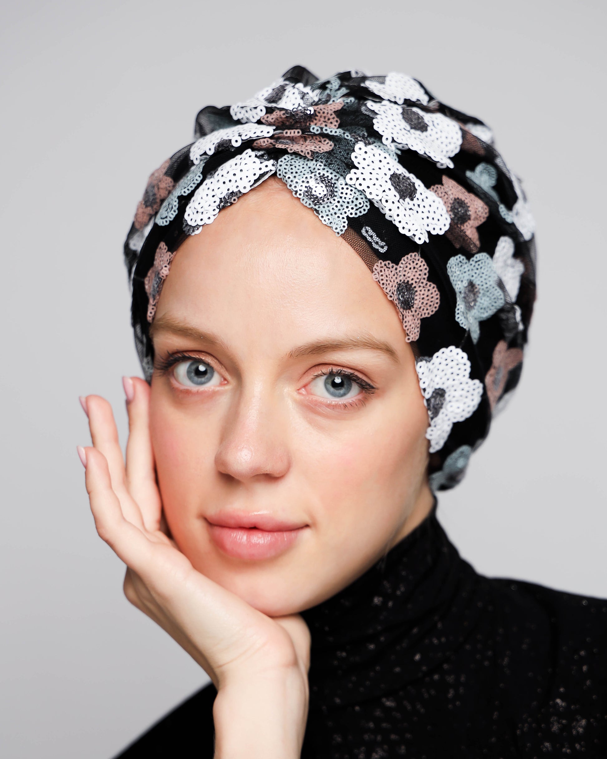 Indulge in a touch of opulence with our Flower Sequin Turban. Exquisitely crafted with delicate floral sequins, this turban adds a luxurious and unique touch to any outfit. Elevate your style with this elegant and exclusive accessory.