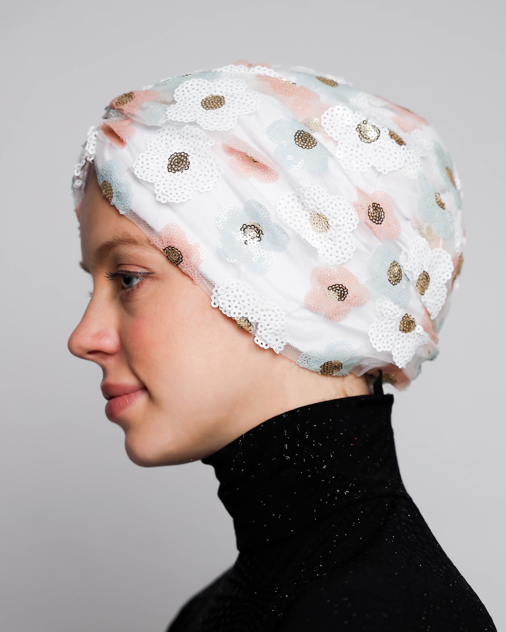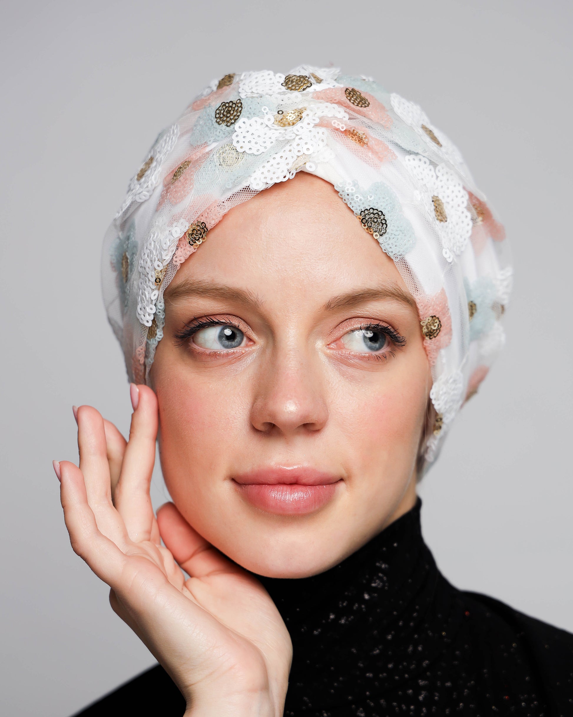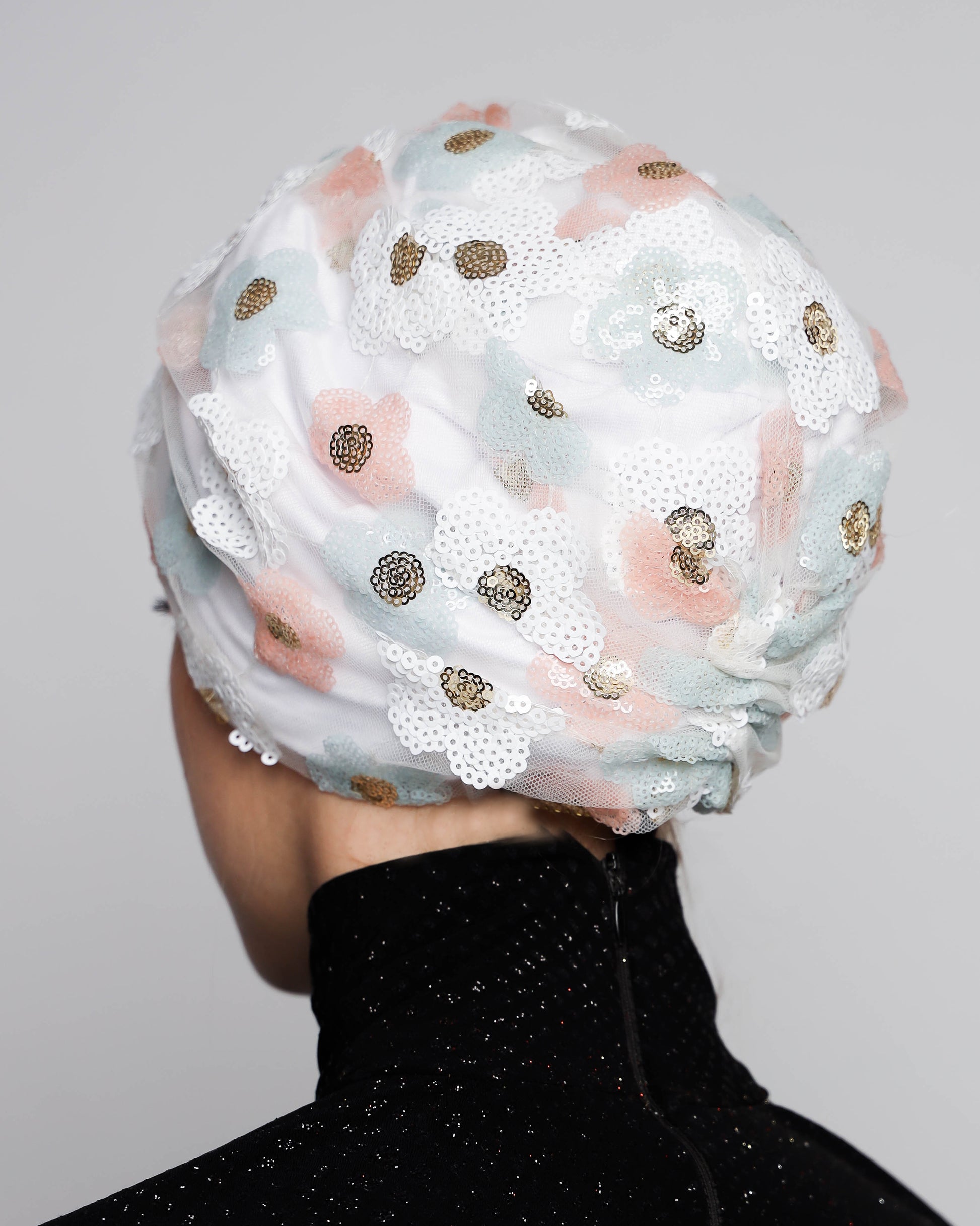 Indulge in a touch of opulence with our Flower Sequin Turban. Exquisitely crafted with delicate floral sequins, this turban adds a luxurious and unique touch to any outfit. Elevate your style with this elegant and exclusive accessory.