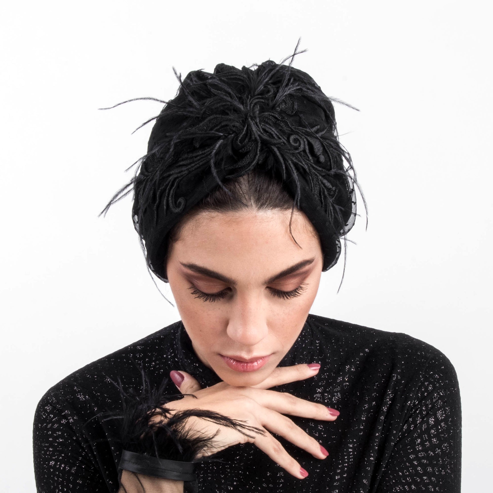 Introducing our glamorous feathery turban, the must-have accessory for the fashion-forward. Made with delicate tulle and elegant guipure, this one-of-a-kind polka dot feather turban is sure to elevate any outfit. With one size fitting all, it's the perfect addition to your high-fashion wardrobe.