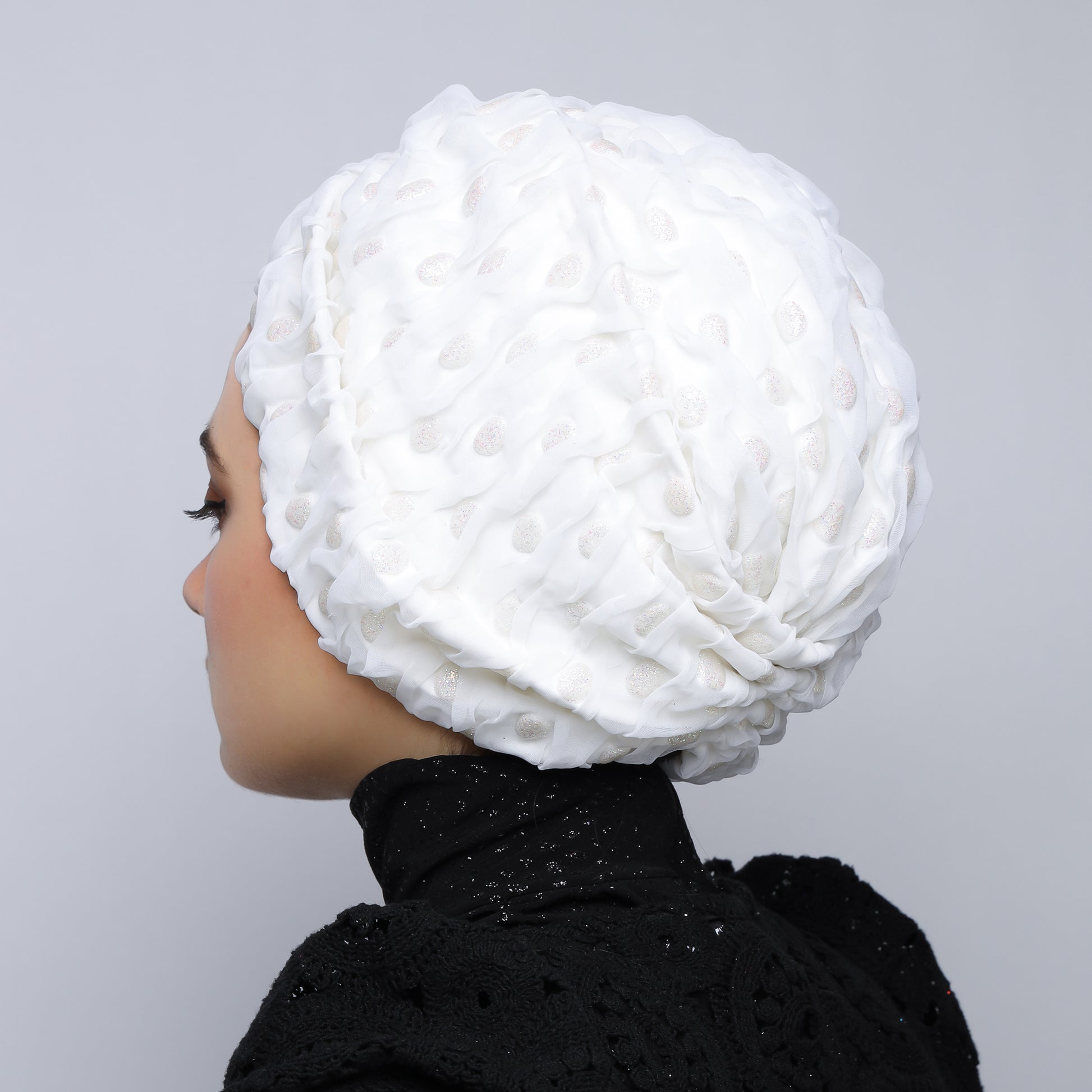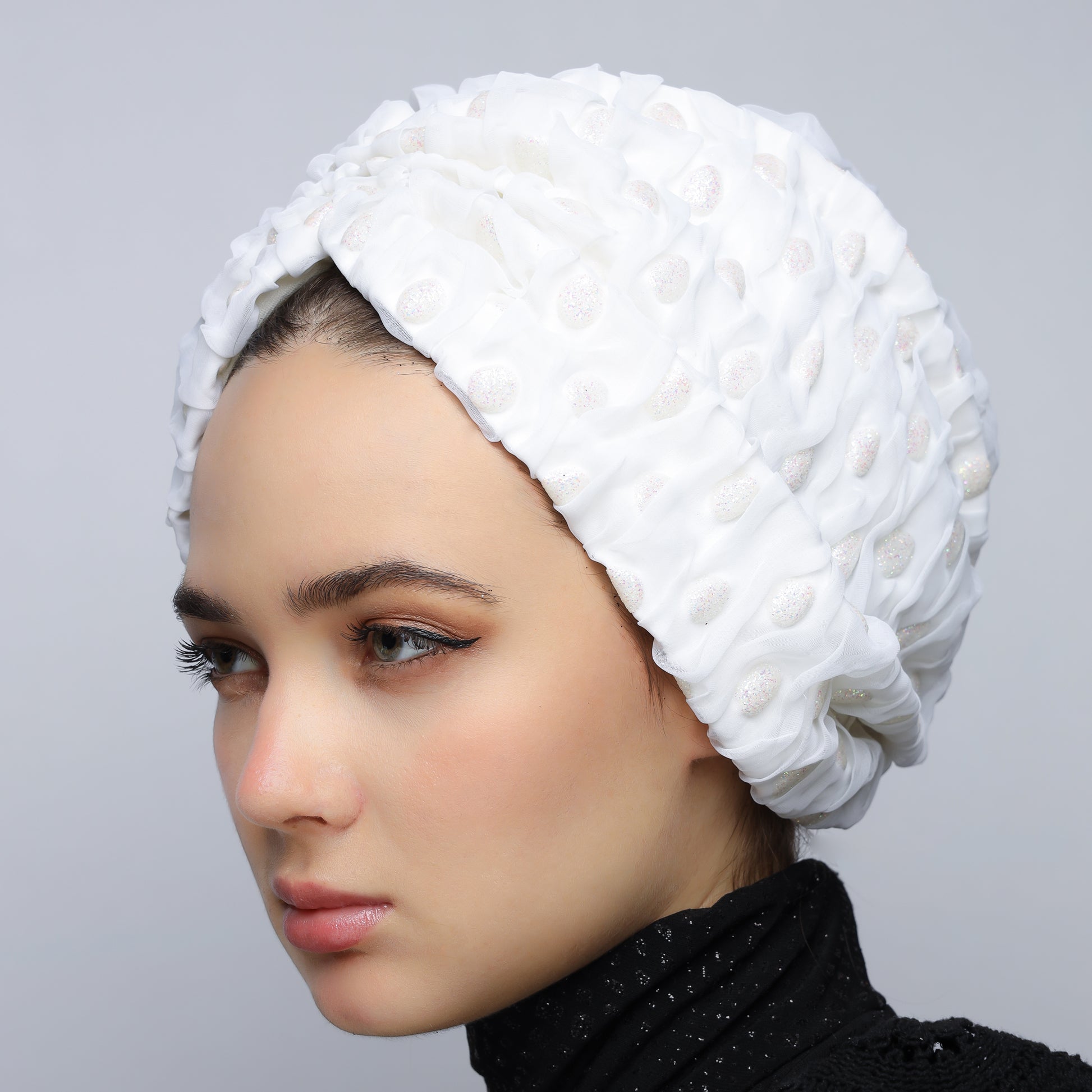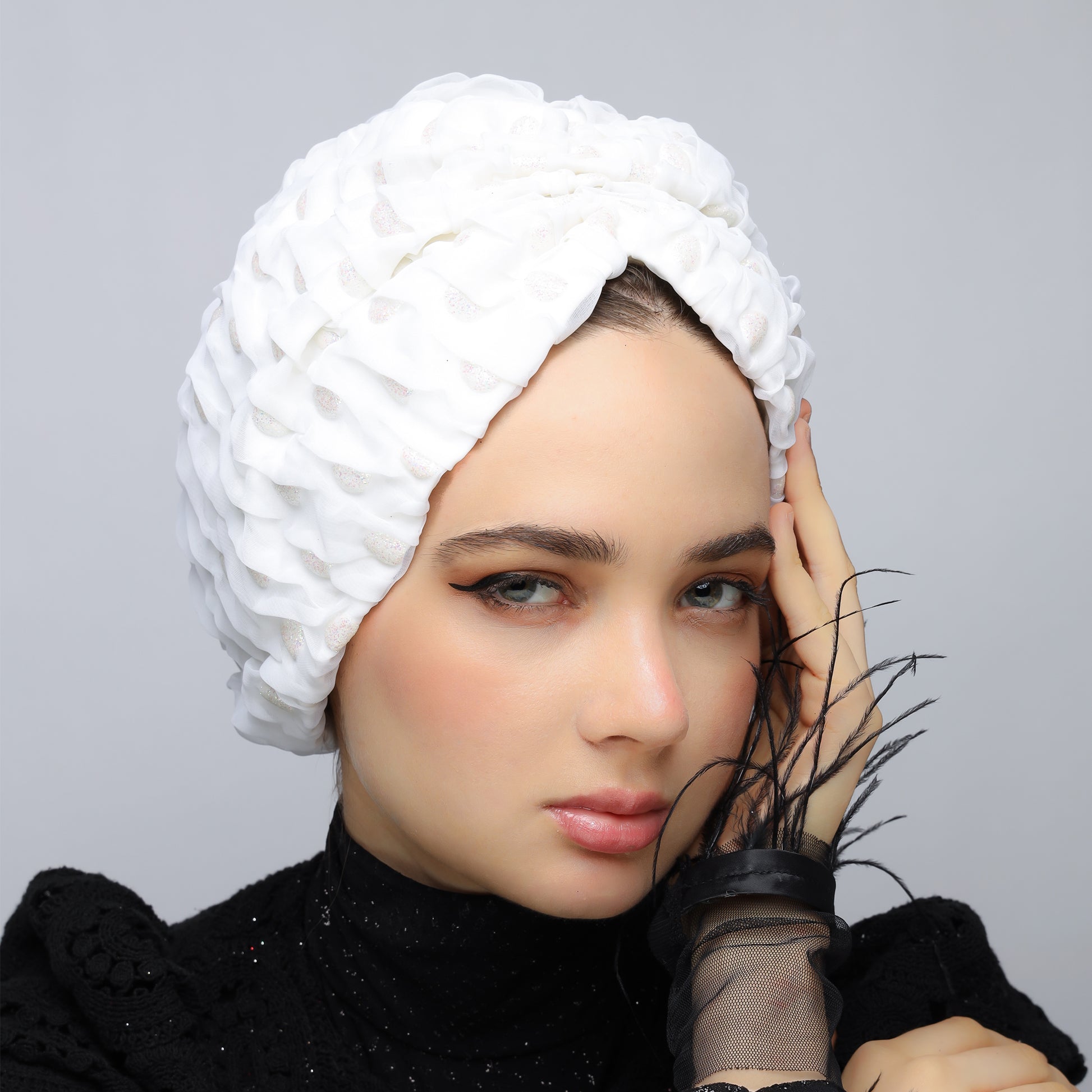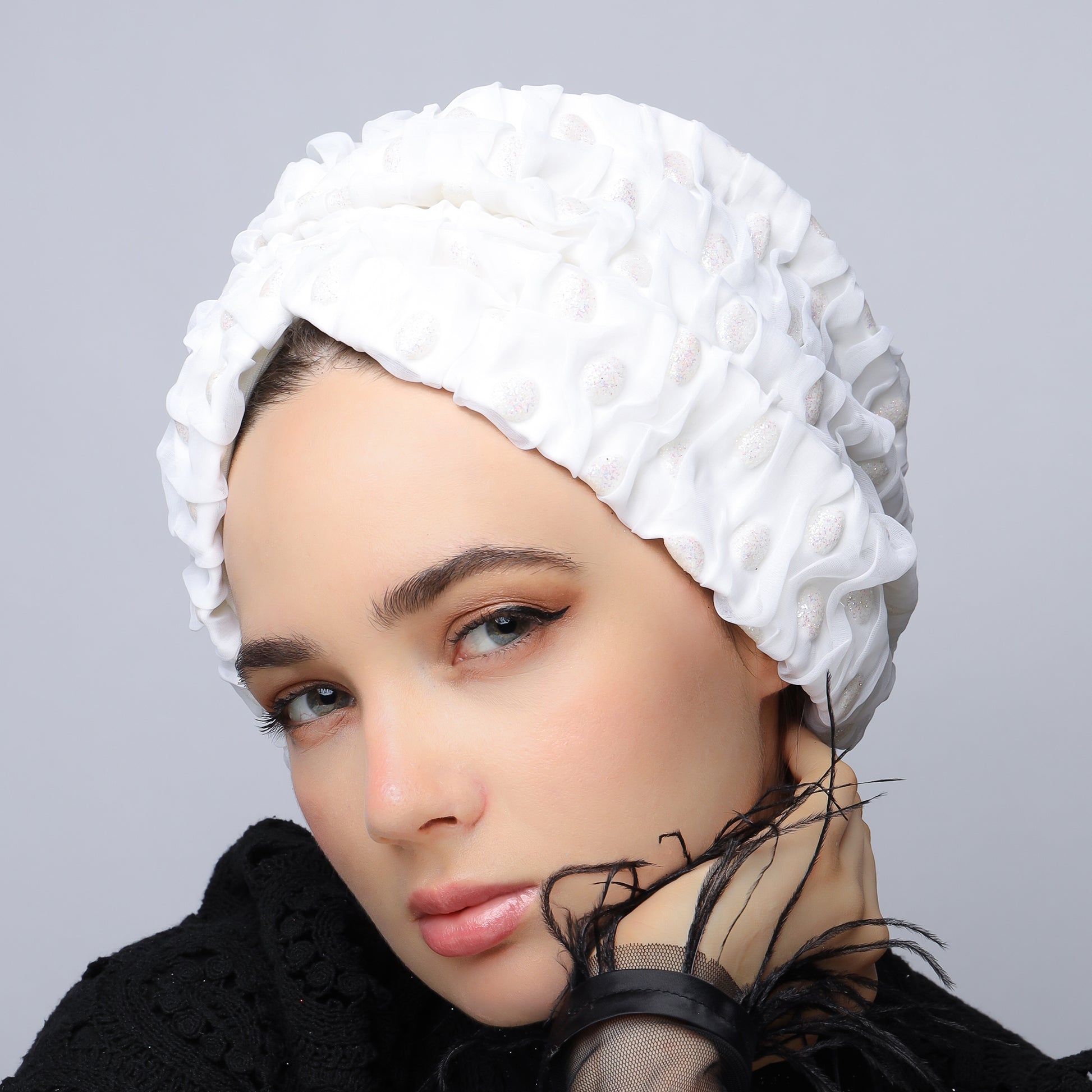 Transform your look with our Glowing Polka Dots Turban. The dazzling fabric is manipulated to create a gathering effect, accented with glittery polka dots. Lined with soft cotton, this turban is one size fits all for comfort and versatility. An effortless way to add some sparkle to any outfit.