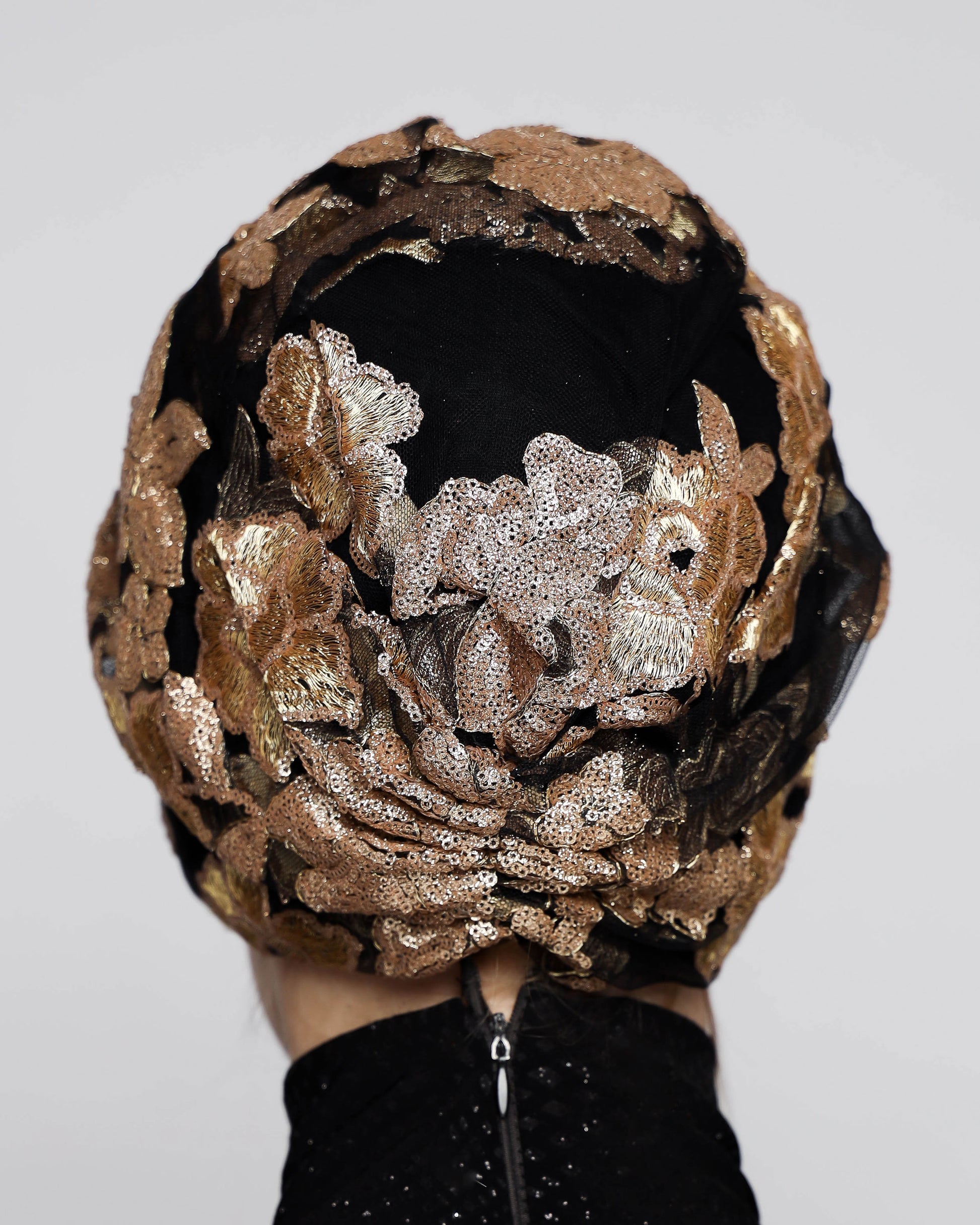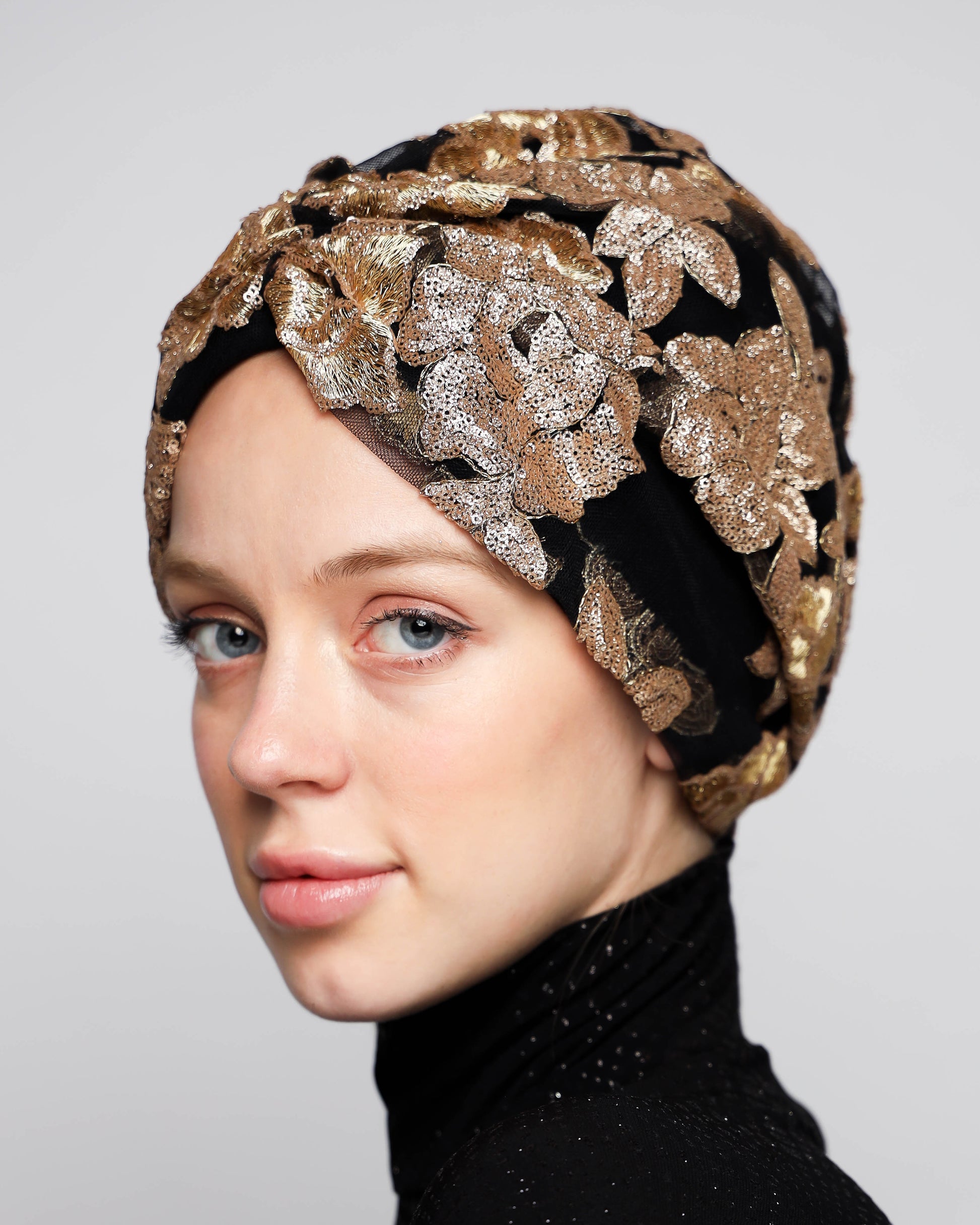 Elevate any outfit with our Gold Sequined Flower Turban. Hand-crafted with intricate sequined flowers, this turban exudes luxury and elegance. Perfect for a night out or a special occasion, it will make you stand out and add a touch of sophistication to your look.