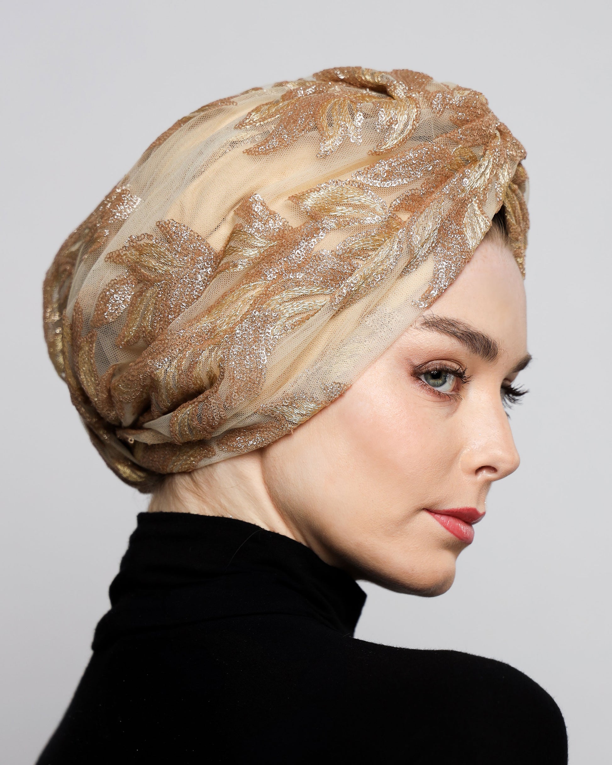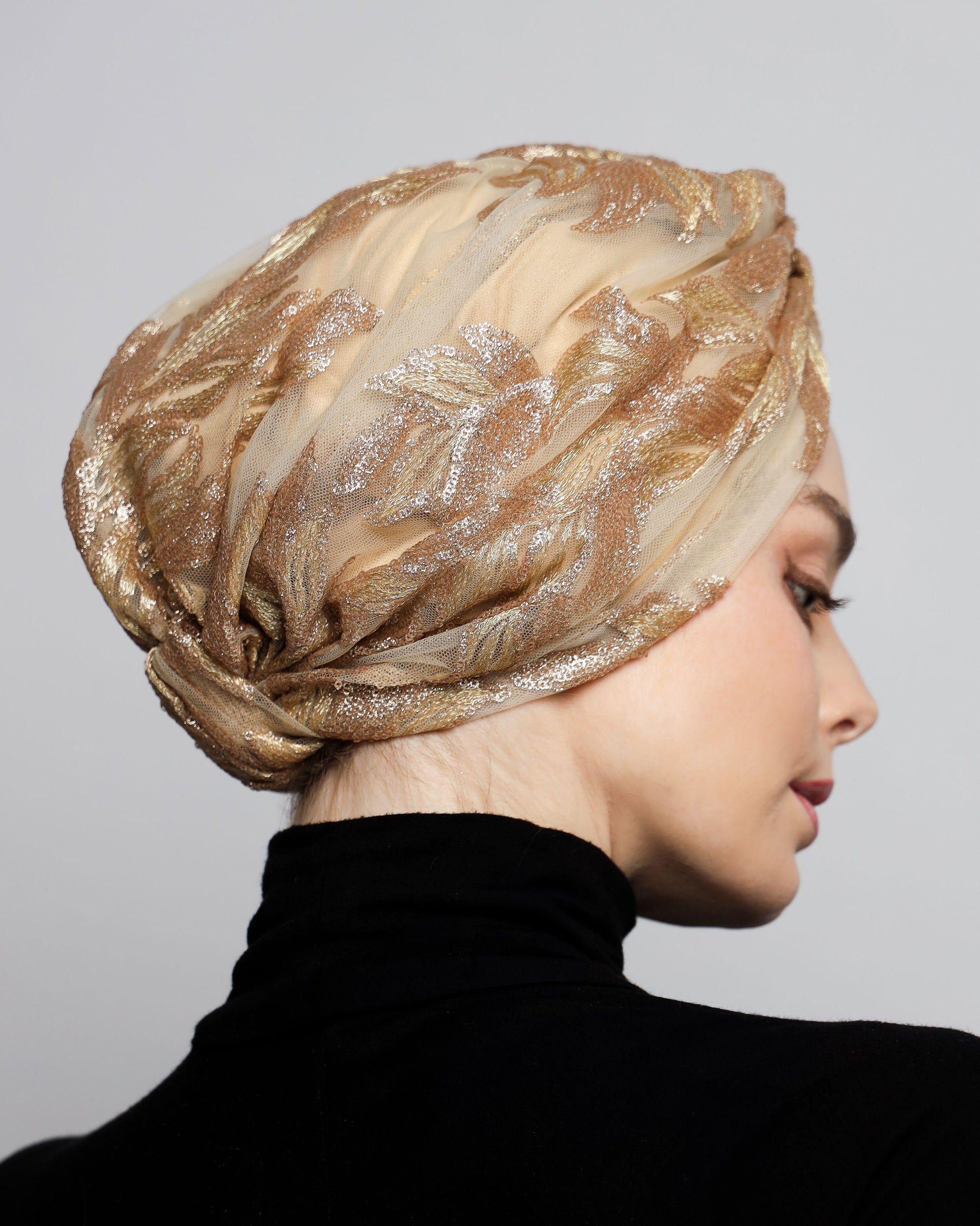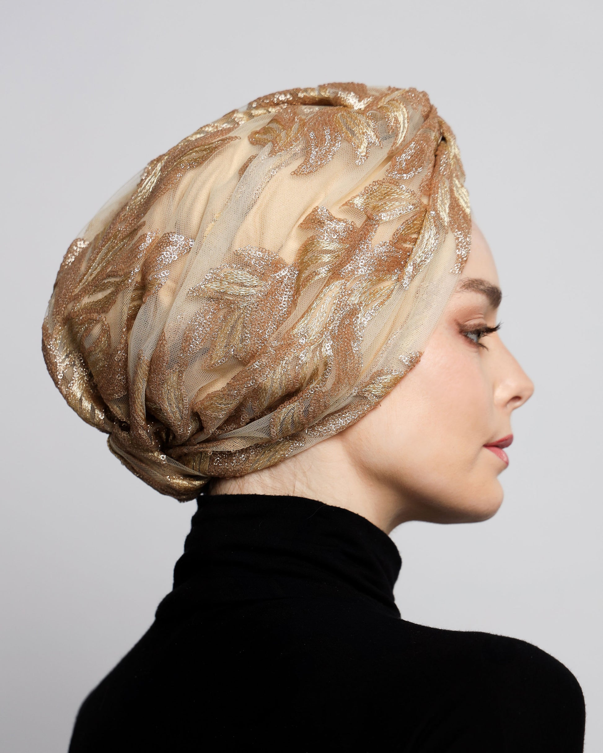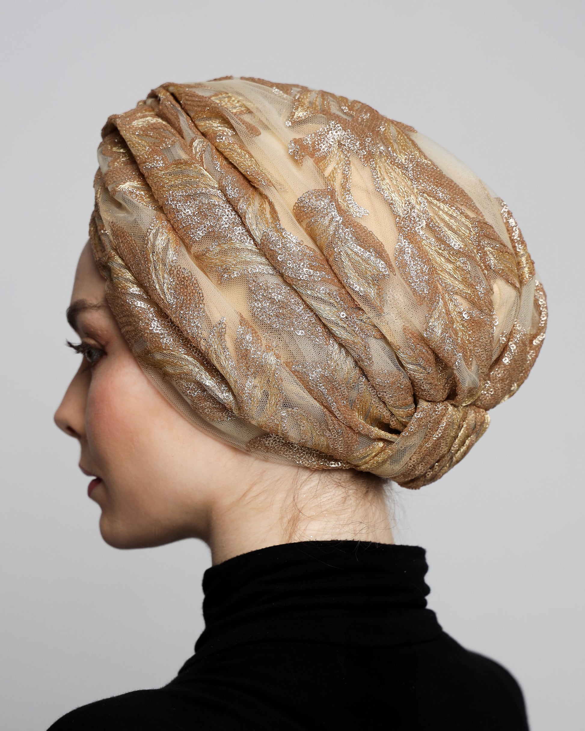 Introducing our Golden Sequin Turban, a luxurious headpiece adorned with shimmering sequins in a delicate leaf pattern. Lined with pure cotton, this turban offers premium comfort and style. Elevate any ensemble with a touch of golden elegance.