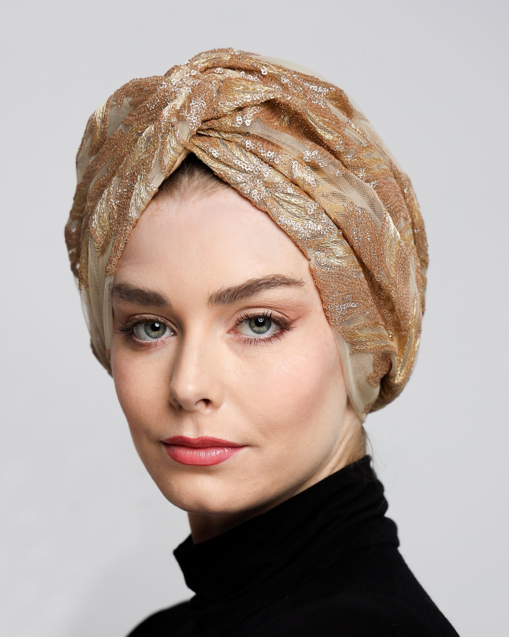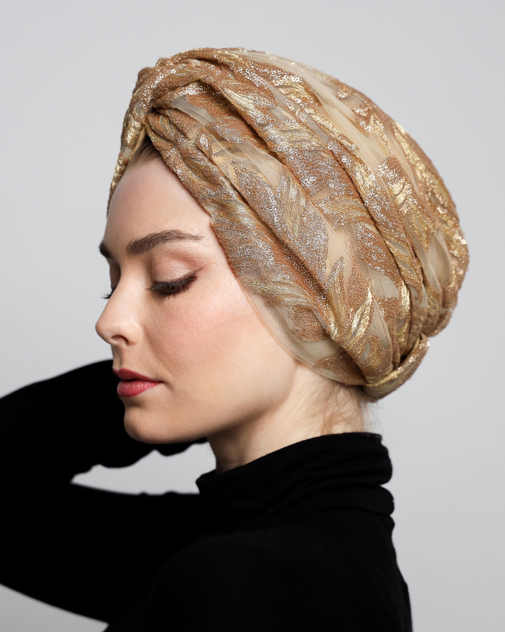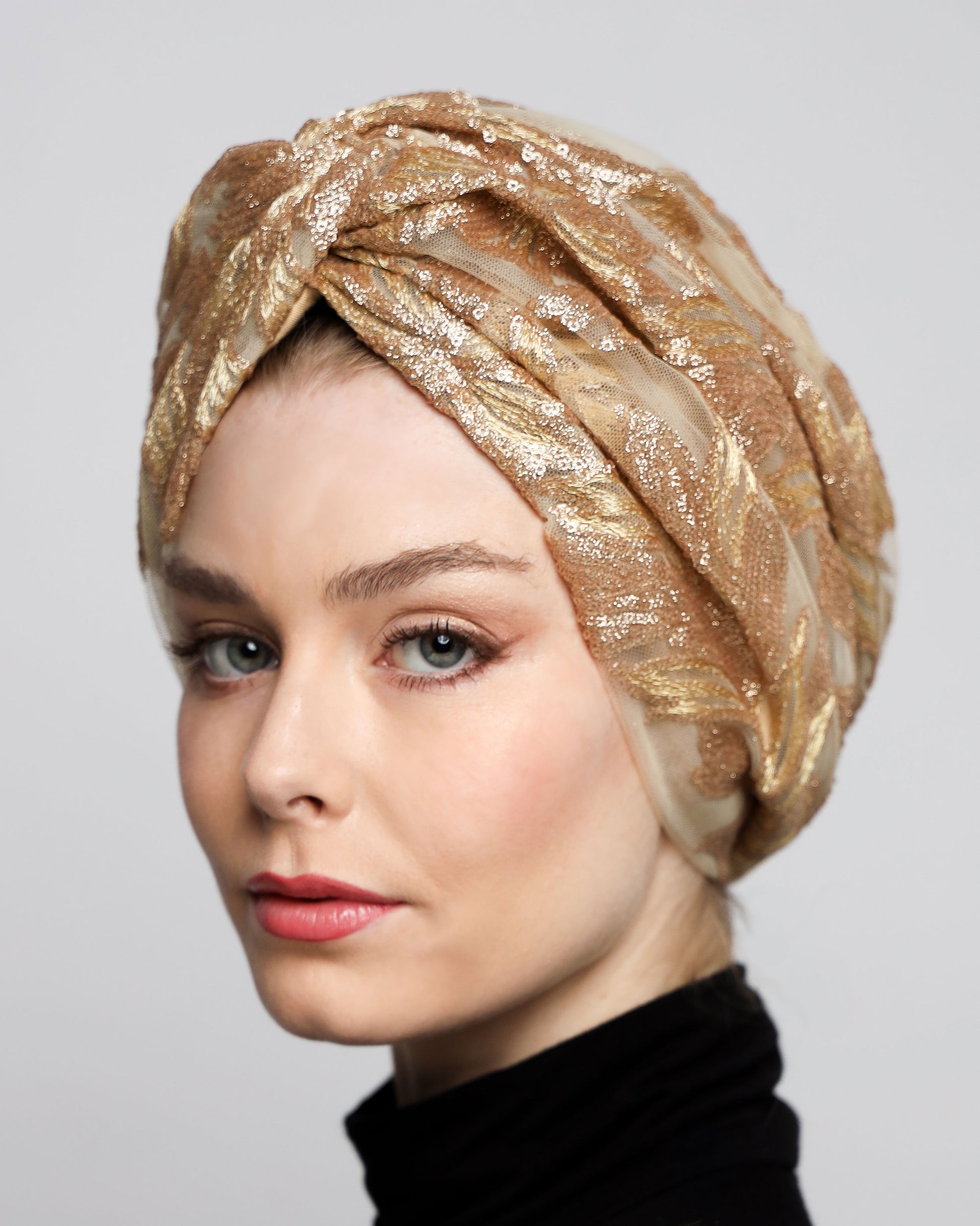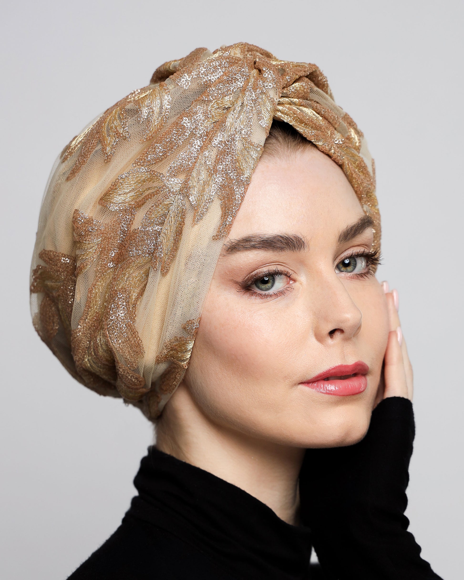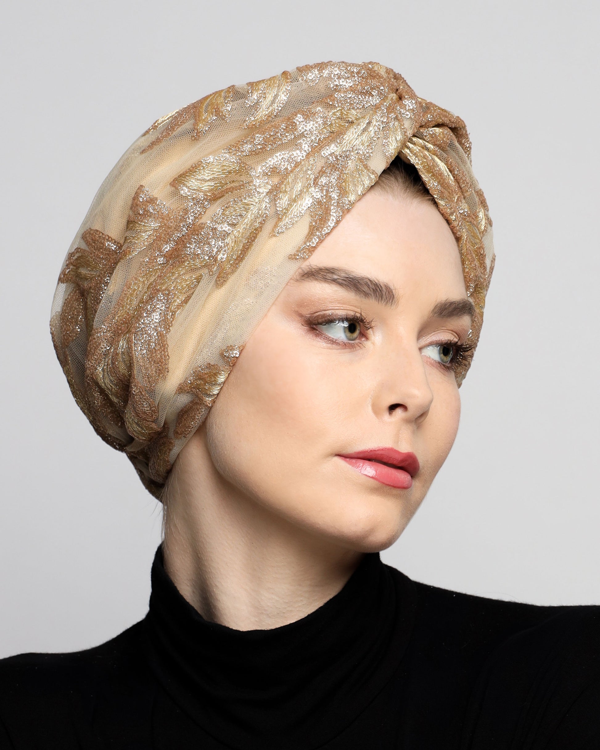 Introducing our Golden Sequin Turban, a luxurious headpiece adorned with shimmering sequins in a delicate leaf pattern. Lined with pure cotton, this turban offers premium comfort and style. Elevate any ensemble with a touch of golden elegance.