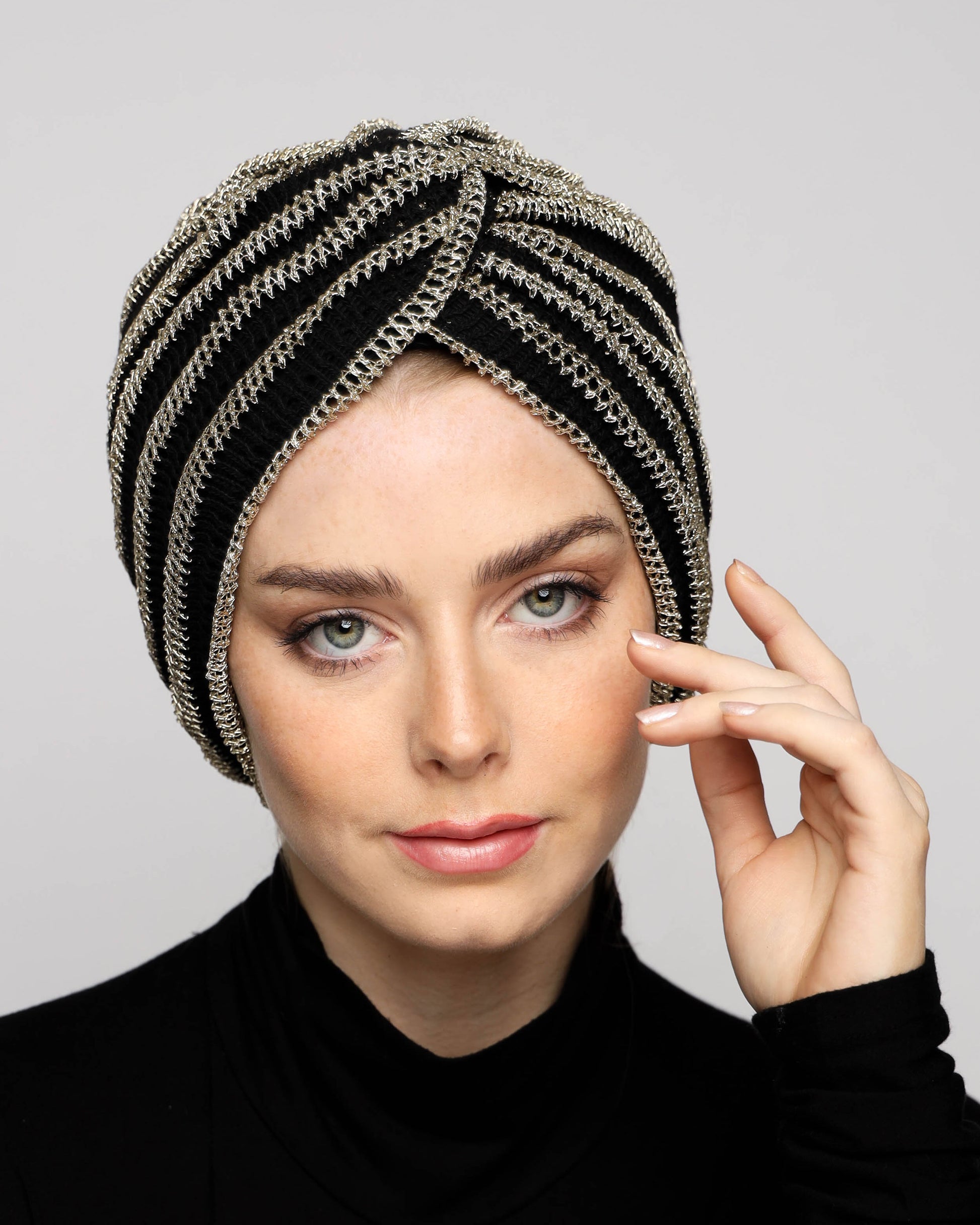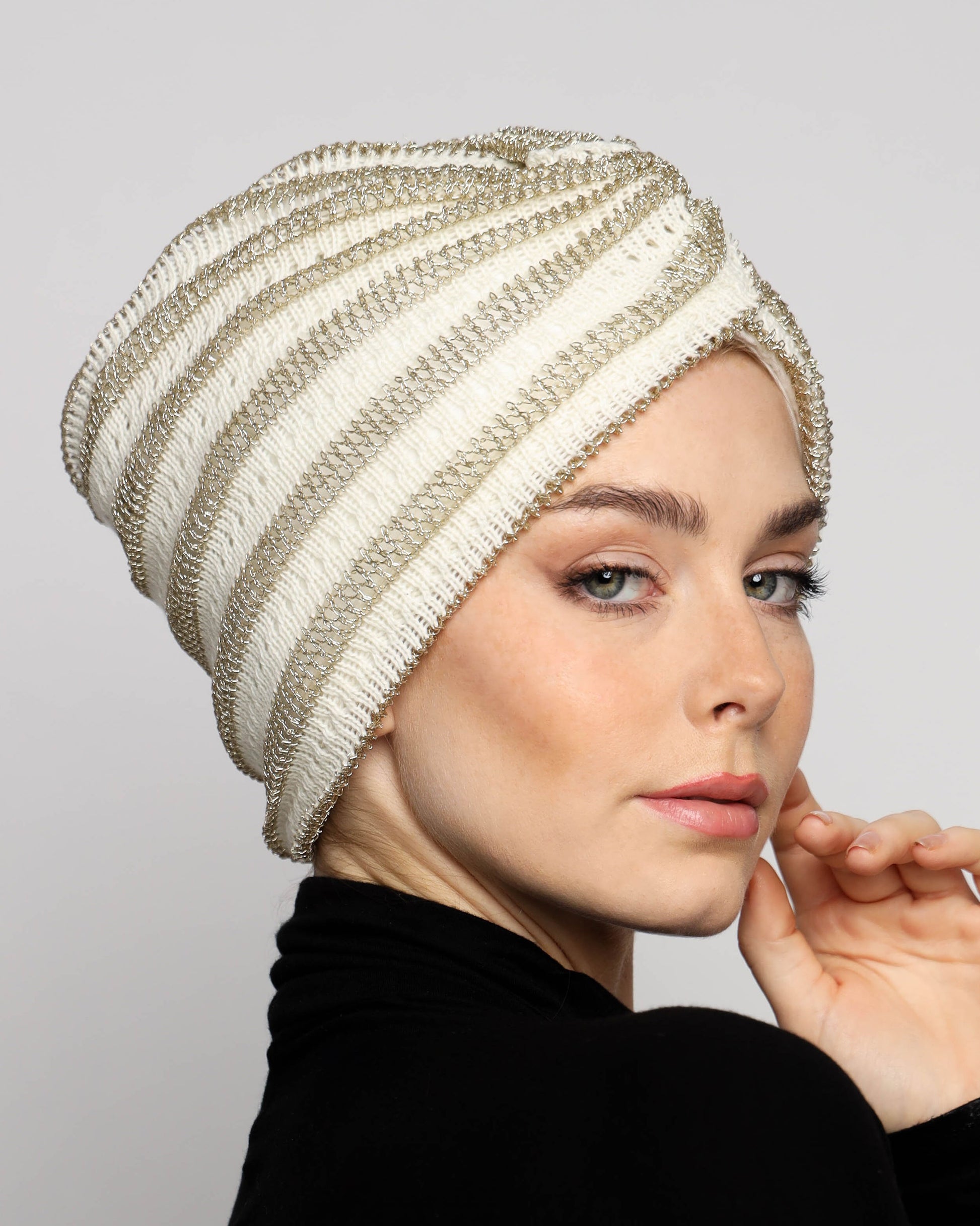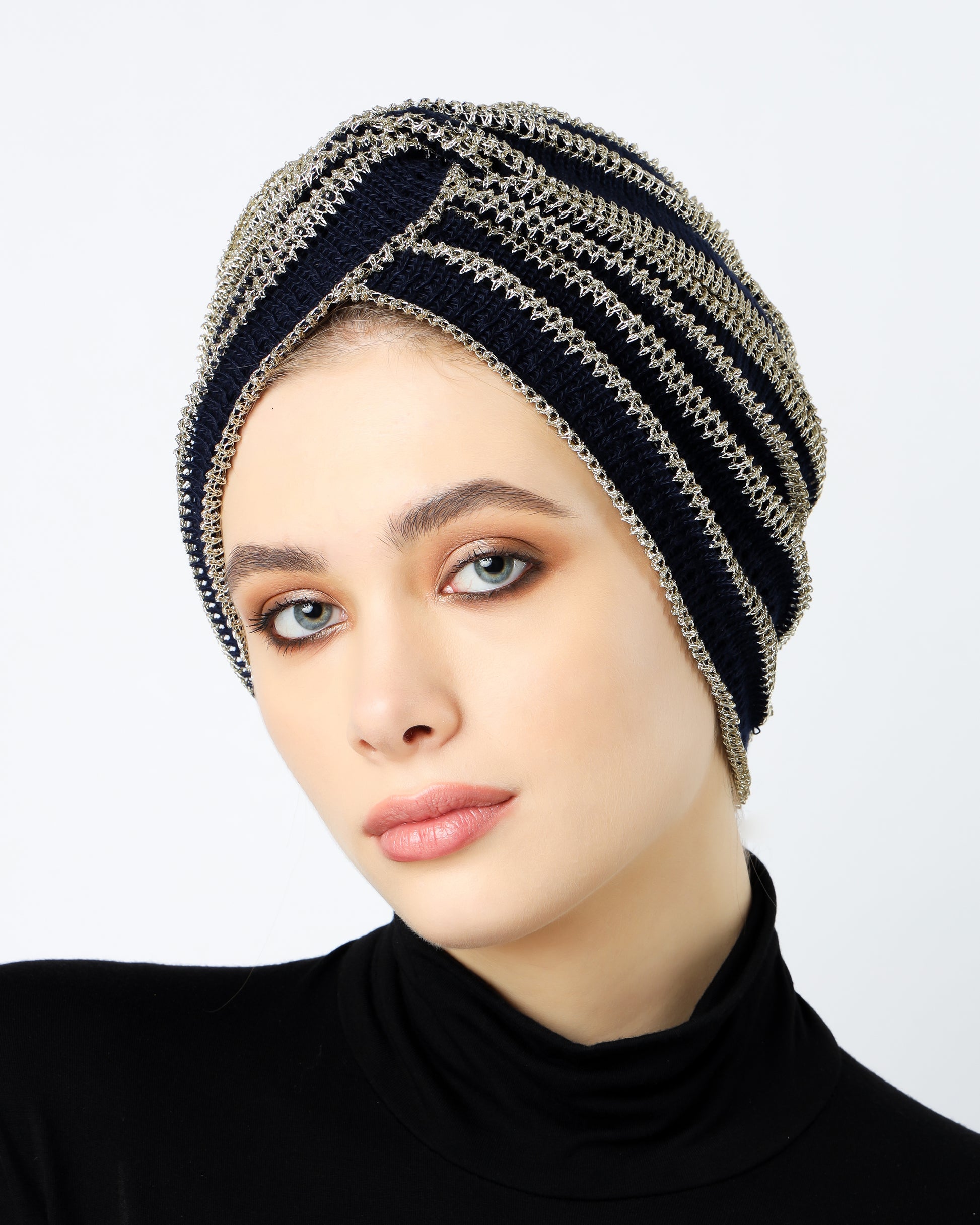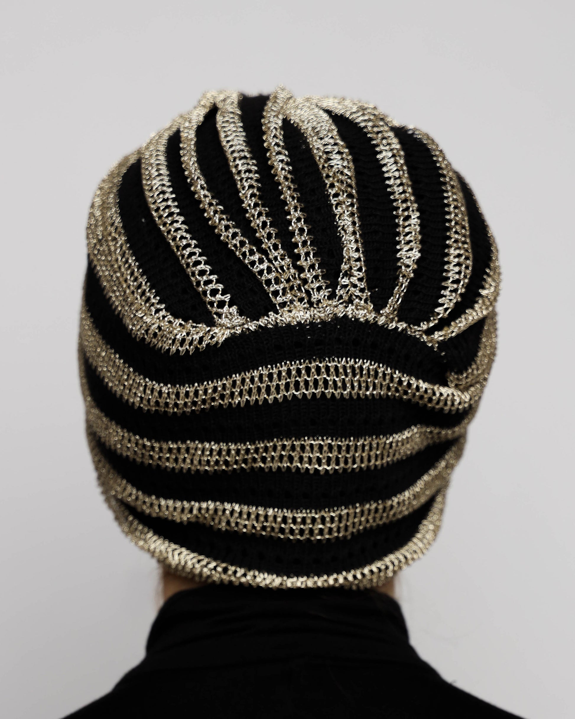 Indulge in luxurious comfort with our Knitting Turban. Featuring elegant gold knitting lines and a soft cotton lining, this one size fits all turban adds a touch of sophistication to any outfit. Perfect for a relaxed day or a night out on the town. Elevate your style with our Knitting Turban.
